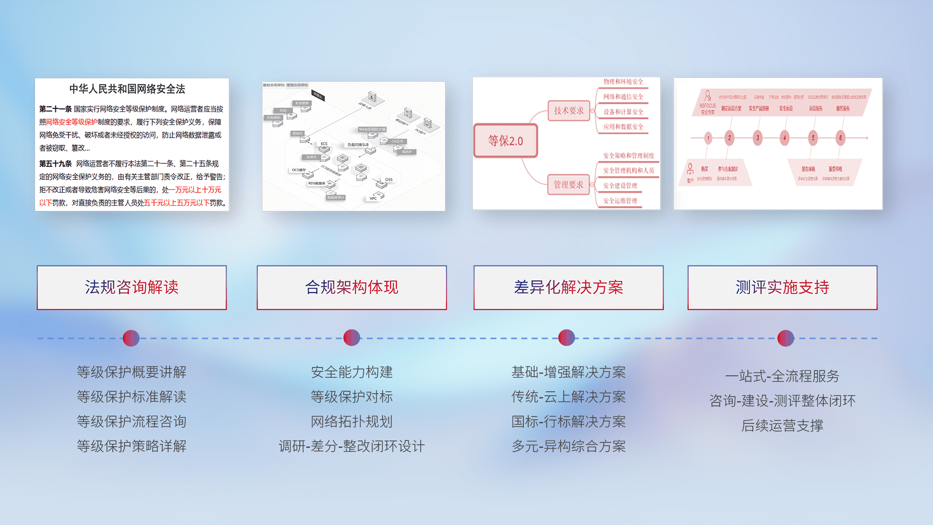 通过专业的法律咨询解读、、、合规架构体现、、差异化解决方案、、、测试实施支持等服务,,,,为客户量身打造等保合规体系。。。。
